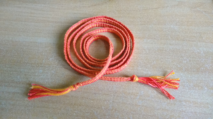 Получалось довольно криво, как видно на фото процесса, но после смачивания водой и вытягивания шнур стал ровнее.
