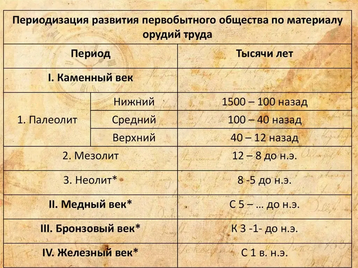 - Палеолит — 2,6 млн – 12 тыс. лет назад