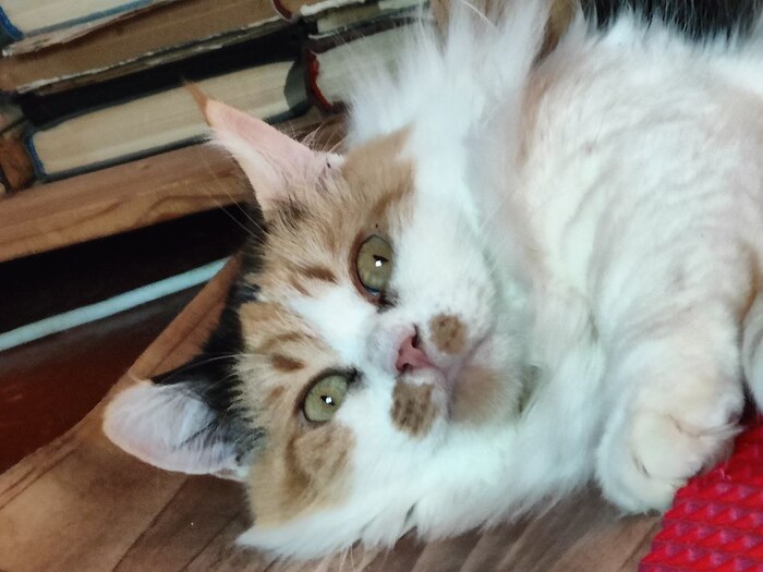 Когда я зашла, котята гоняли маму по полу, весело играя, а один, лежал уткнувшись мордочкой в диван и спал (он выглядел таким несчастным на фоне всего этого бедлама), и как только я его увидела, приняла, Это Мой) Мне стало так жалко Малыша, хотелось взять на руки и прогладить,таким несчастным он мне казался.