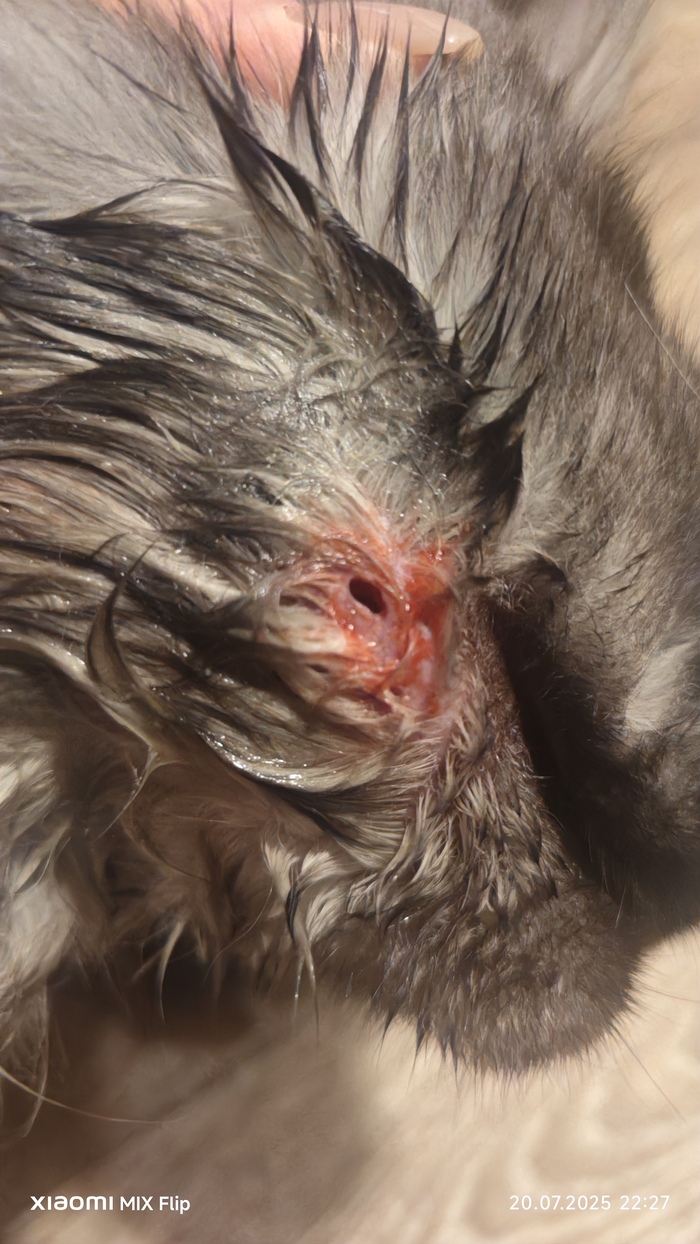 Уже не первый раз сталкиваемся вот с такими ранами у котов. Живём за городом, у котов есть доступ к улице. Раны всегда в районе морды. Сначала из-за шерсти ничего не видно, потом начинает гноиться, после удаления гноя и обработки раны быстро заживают. Края ран очень ровные. Коты хоть и гуляют на улице, с участка не уходят, то есть драку с другими котами можно исключить. Не могу понять что может к такому приводить. Может кто-то сталкивался?