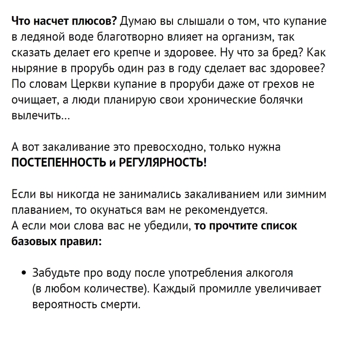 Массовое распространение традиция получила после распада СССР. Традиция не является церковным обрядом и не предписывается церковным уставом. Придумали её не богословы, а простые люди, которые совершают этот обряд исключительно по собственной инициативе. По мнению представителей Русской православной церкви, повсеместное представление людей об очищении от грехов посредством троекратного погружения в освящённую прорубь-иордань является ошибочным. – Такое определение выдает Википедия, мы же сегодня рассмотрим купание в холодной (ледяной) воде с медицинской точки зрения.