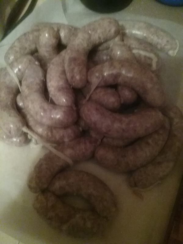 1,5 кг свинной обрези и 0,5 кг говядины пропустить через мясорубку с крупной решеткой, лук и чеснок через мелкую решетку два раза. Добавить соль, черный и красный перцы. Все хорошо перемешать. Через кондитерский мешок начинить череву.