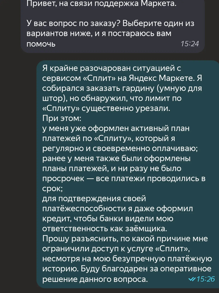 По какой причине было принято решение об ограничении услуги «Сплит» при безупречной платёжной истории?