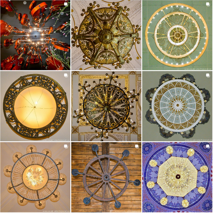 На этих скринах часть моей небольшой коллекции люстр и куполов. Люблю иногда взглянуть наверх и посмотреть как выглядит люстра или купол помещения в таком ракурсе. Публикую всю эту красоту в отдельном аккаунте в инсте - https://www.instagram.com/chandeldome.