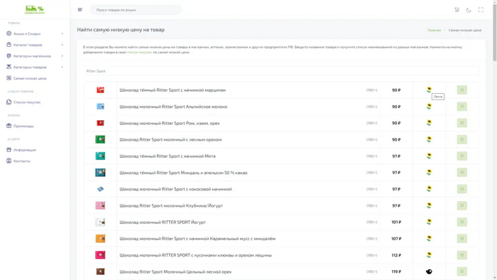 Собирая свой список покупок, я ввожу необходимый товар в поле поиска на странице «Самая низкая цена» и сервис показывает самую низку цену конкретного товара в магазинах на данный момент.