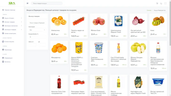 Как мы видим, скидки отслеживаются не только в супермаркетах, но и в аптеках, зоотоварах и магазинах красоты. Если нам необходимо посмотреть скидки в конкретном супермаркете, мы можем зайти на страницу и посмотреть, какие товары продаются по скидке прямо сейчас. Настроить фильтр и выбрать ценовой сегмент, процент скидки, категорию товара или найти продукт именно в этом супермаркете в поиске.