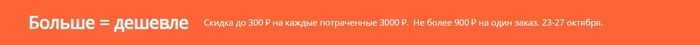 С 23 по 27 октября на Алиэкспресс будет действовать скидка 300₽, 600₽ и 900₽ при покупке от 3000₽, 6000₽ и 9000₽. Товары которые участвуют в акции помечены специальным текстом. При добавлении товара в корзину, скидка применится автоматически. Промокоды и специальные купоны для этого не требуются.