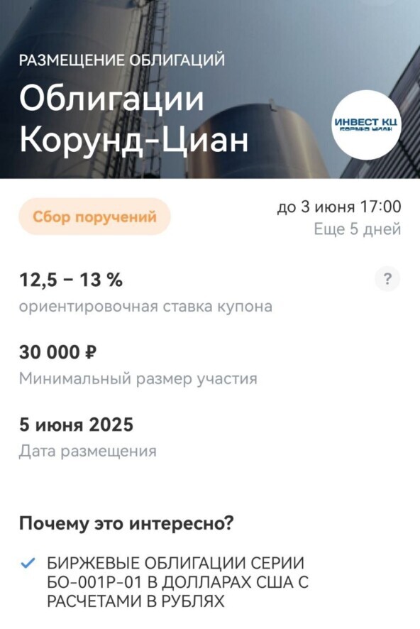 Новый выпуск облигаций Корунд-Циан с купоном до 13% в долларах!