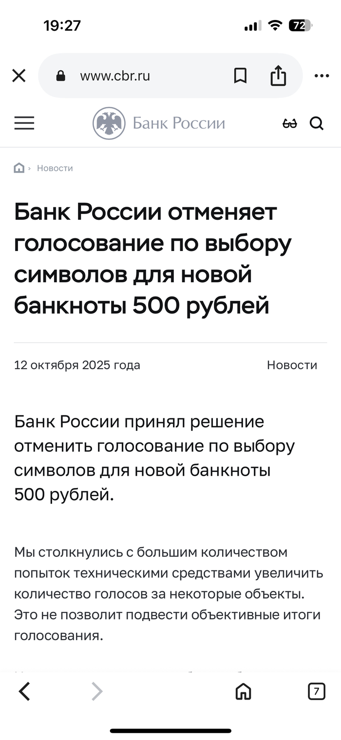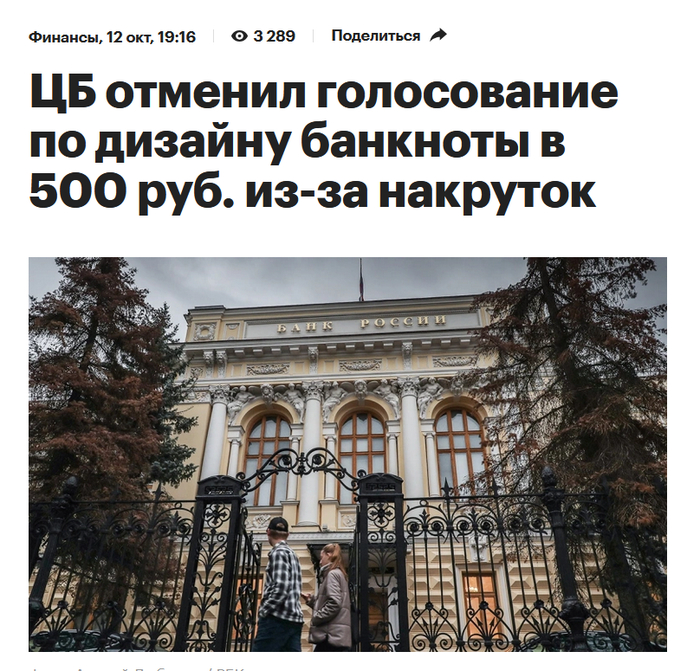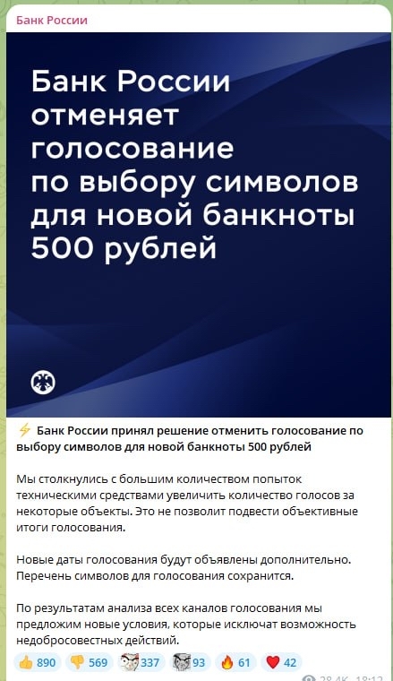 Банк России отменил голосование на своем сайте за дизайн новой банкноты в 500 руб., говорится на сайте регулятора.