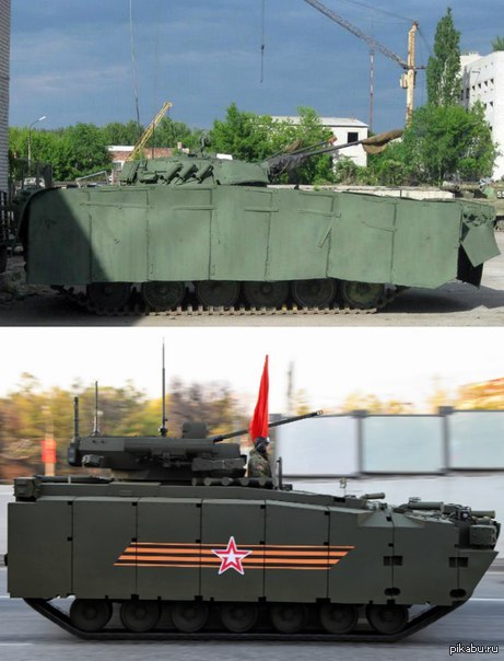 Еще одна особенность новых бронемашин — их силуэт. Он, примерно соответствуя высоте американских и германских БМП, несколько выше традиционно низкого силуэта отечественной бронетехники. Но это не недостаток, а достоинство. Легендарный Т-34 создавался под бойцов среднего роста в 167 см. Те же нормативы существовали и в 1960-е. Но с тех пор люди стали крупнее. Да и вернулось в обиход защитное вооружение. Пехотинец Великой Отечественной имел лишь каску из уральской стали. А вот современный мотострелок кроме защитного шлема имеет экипировку массой более 30 кг: защитные маску, очки, бронежилет, радиостанцию, многофункциональный пульт управления. И в десантных отсеках БТР или БМП есть смысл в ношении боевого защитного комплекта — еще один слой защиты никому не мешал. Но — для этого необходим дополнительный заброневой объем.