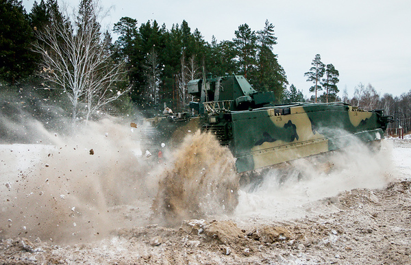 Боекомплект 30-мм пушки 2А42 конструкции академика А.Г. Шипунова и В.П. Грязева — 500 снарядов. Именно столько можно выпустить без введения специальных и крайне тяжелых систем охлаждения, например водяного. Питание осуществляется из двух бункеров, переключаемых в зависимости от класса цели. Для пехоты и небронированных целей имеется 340 осколочно-фугасных снарядов. Для бронецелей — 160 бронебойных подкалиберных снарядов. Максимальный угол возвышения орудия — 70 градусов. Пушка может работать и по воздушным целям — высокая динамика необитаемой башни и зоркая электронно-оптическая система это позволяет. Ну а еще — до предела «вылизанный» десятилетиями массового производства пулемет ПКТМ калибра 7,62 мм с боекомплектом в 2000 патронов. Он классифицируется как вспомогательное вооружение, но может играть большую роль в системе активной защиты для стрельбы по кумулятивным боеприпасам. Не забудем и о малогабаритных дронах, которых все больше и больше будет появляться над полем боя. Трехлинейный патрон — именно то, что таким крошкам надо.