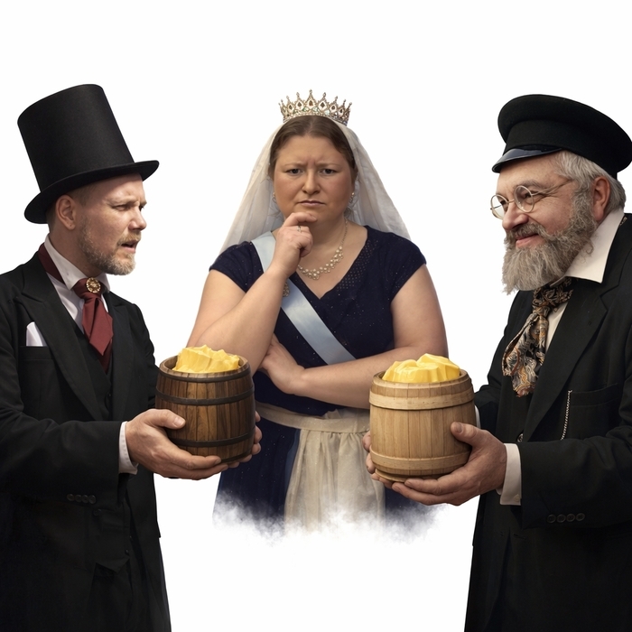 Решил вернутся к своей идее и её интерпретации от @ComedyAlligator , но максимально всё упростить. Убираем и буржуев и крестьян. Оставляем только датчанина, Балакшина и королеву. Борются они теперь не на куске масла, а на столе. Уже как-то понятнее, но выглядит так что они не борются за право поставки масло королеве, а как будто она принесла им покушать))