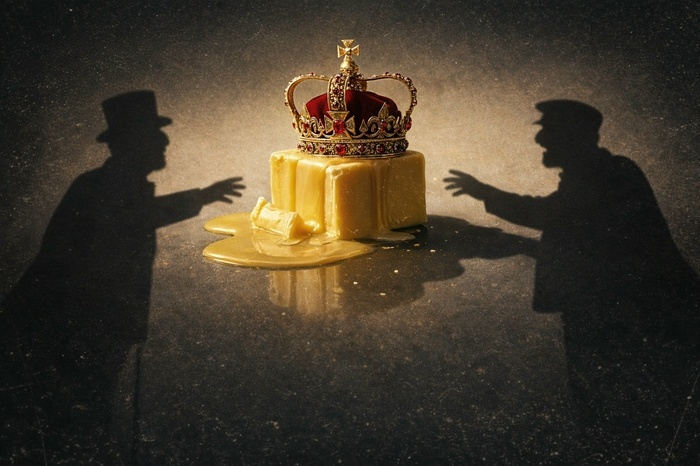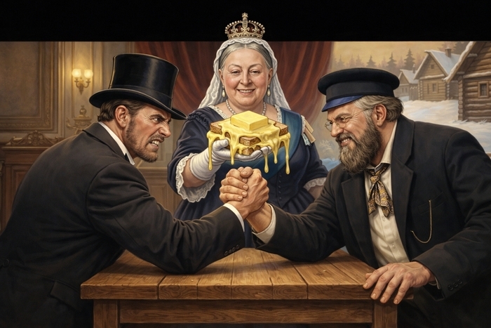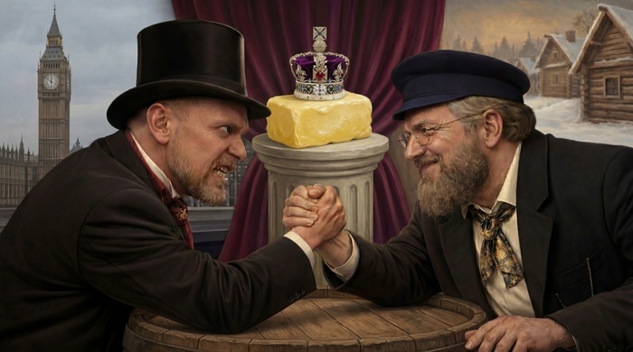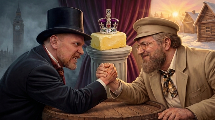 Корректируем... и... мне нравится. Решено оставить так. Карикатура на противостояние Руси-матушки и злобного-злобного Запада. И намёк на масло и королеву. Всё на месте.