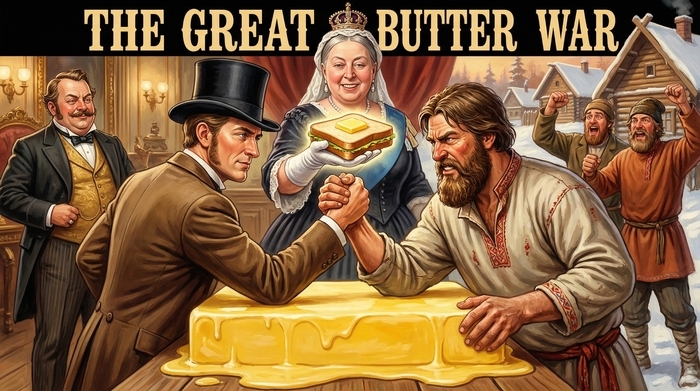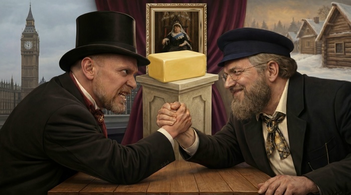 Первый постер, который я по своему ТЗ с первой генерации сделал в чате GPT выглядел так. Я хотел сделать карикатуру на противостояние России с Западом: Балакшин справа (Россия на востоке), за него крестьяне, избы на фоне. Слева датчанин, за него болеет капиталист. И куда-то надо было засунуть королеву с маслом. Куда-то и засунул) Получилось не очень.