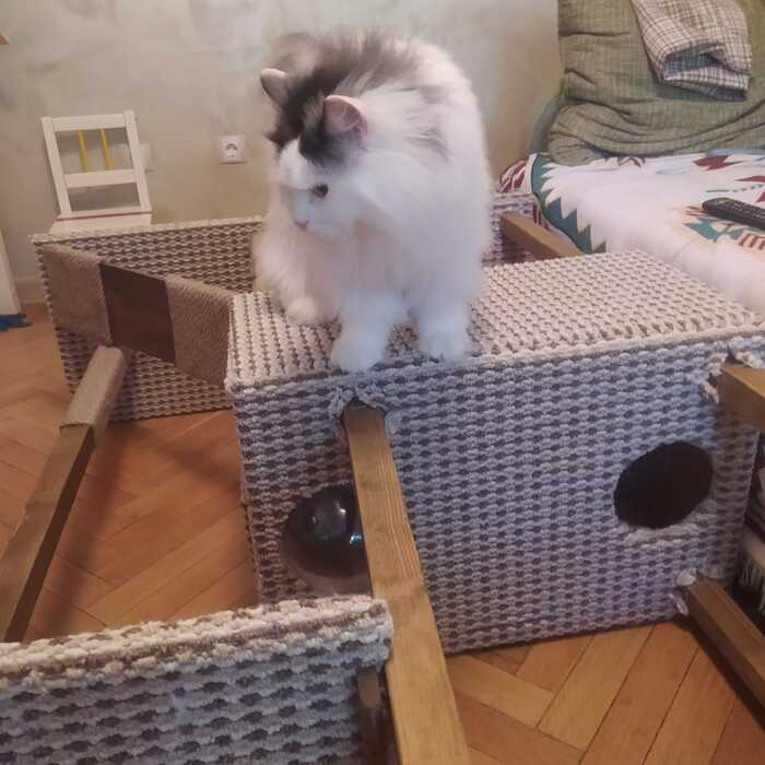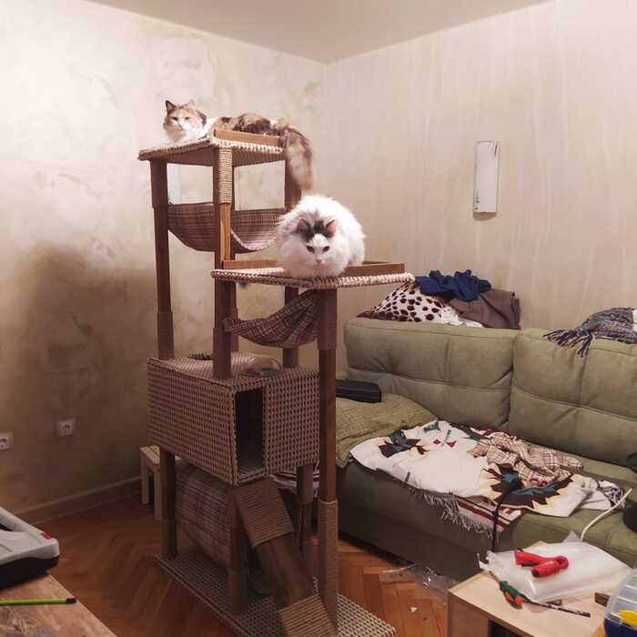 В Леруа закупили и раскроили фанеру и брус, докупили ковролин, джутовый шнур и уголки. В специализированном магазине купили ткань покрепче и покрасивее. Саморезы, двухсторонний скотч, клеевой пистолет + стержни, скобы и степлер в хозяйстве были, на них тратиться не пришлось. Следующие 2 недели пролетели в тумане сборки. Кот, как и обещал, помогал чем мог.