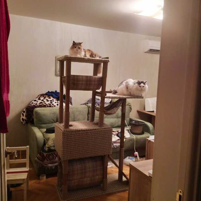Сперва я прошерстила интернет-магазины на предмет покупки кошачьих домиков. Цена и отзывы приводили в уныние. Особо печалило, что место под кошачий комплекс у нас ограничено. И отдавать кошакам треть комнаты я не собиралась. Пришлось мне сесть, взять карандаш, бумагу и нарисовать кошачий дом. Кот дом одобрил. И даже пообещал помочь со строительством.