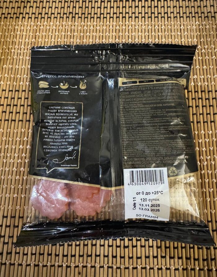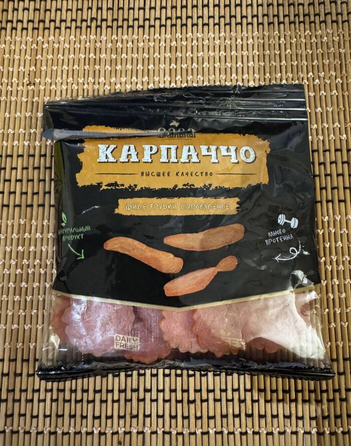 Формат карпаччо – тончайшие слайсы из сыровяленой грудки. Упаковано всё в вакуум, дизайн довольно невзрачный, поэтому не сразу обнаружил его на прилавках.