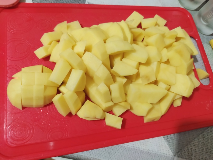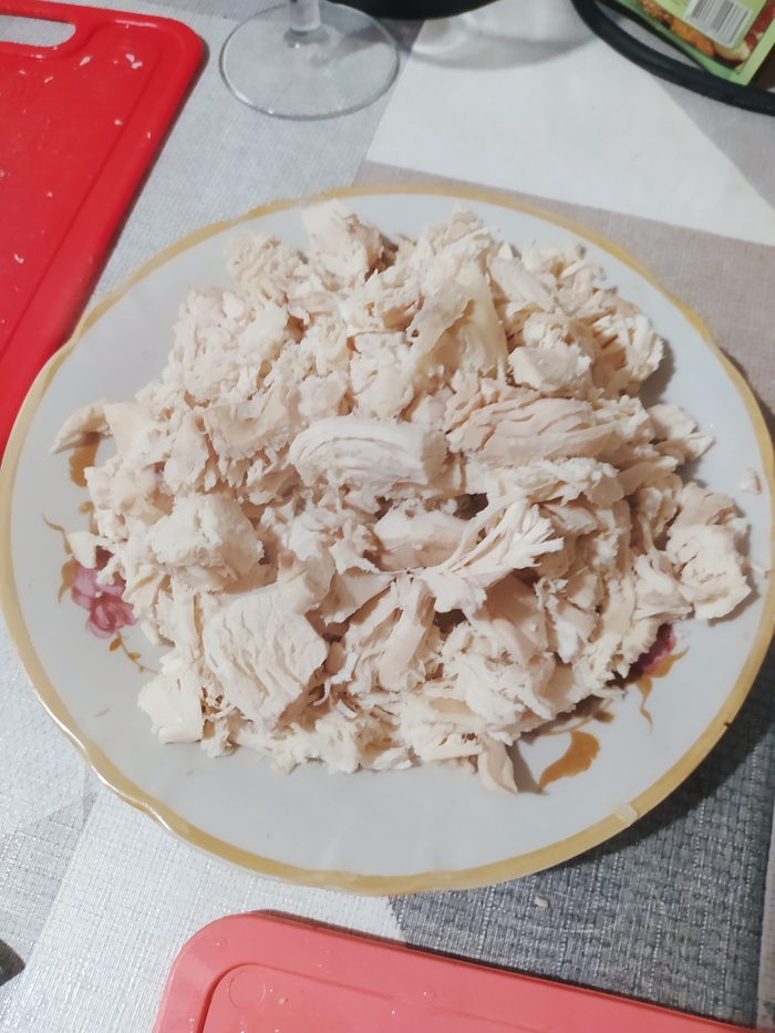 Тем временем бульон уже должен быть готов (варится минут 40), достаем грудку, остужаем и нарезаем на удобные для употребления ломтики. В бульон бросаем вариться картошку.