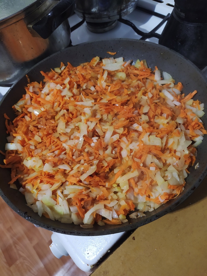 Обжариваем лук и морковь, а через 10 минут добавляем к ним чеснок.