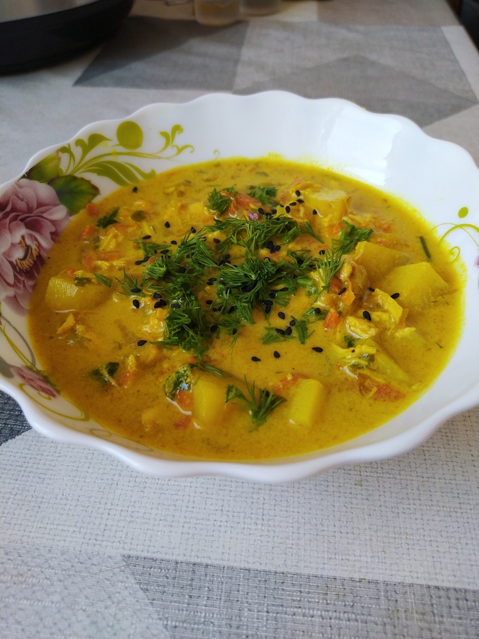 Через 10 минут пробуем картошку. Если готова - перекладываем в кастрюлю курицу и зажарку. Варим минут 5, пробуем и досаливаем по вкусу. Добавляем ложку чили, вливаем все сливки, перемешиваем.