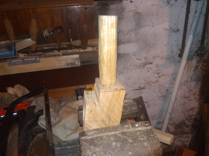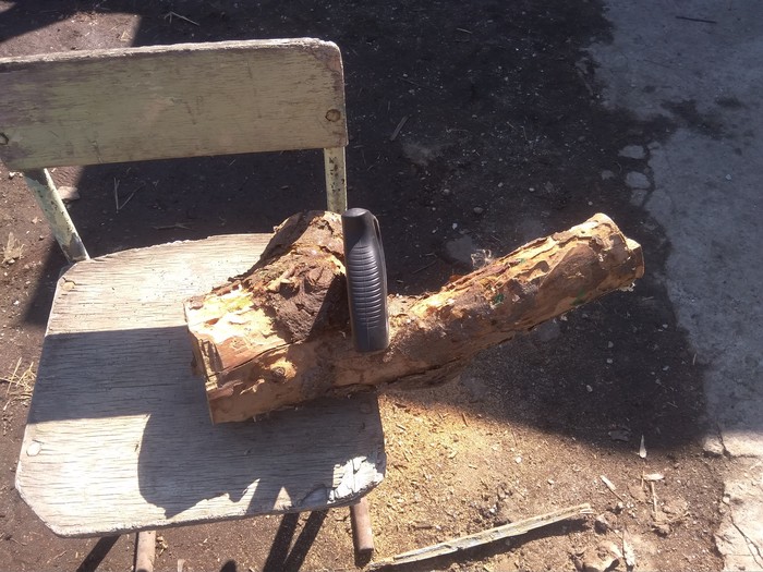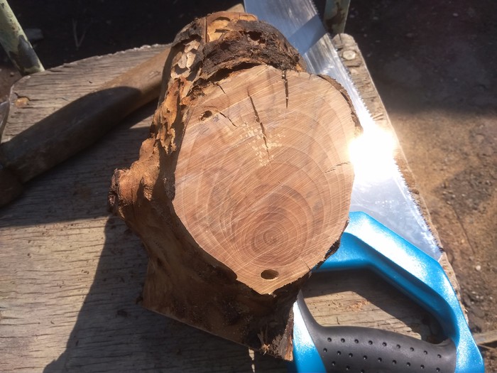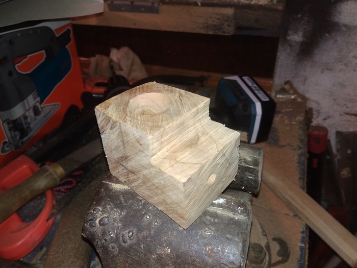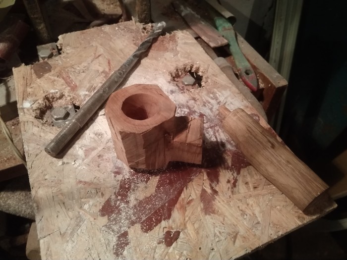 Вот такой кусок получилось вырезать из целого полена. Что поделать, вишня очень сильно трескается, когда сохнет. Далее, сверлю каналы. Для этого из говна и палок я сварил сверлильный станок.