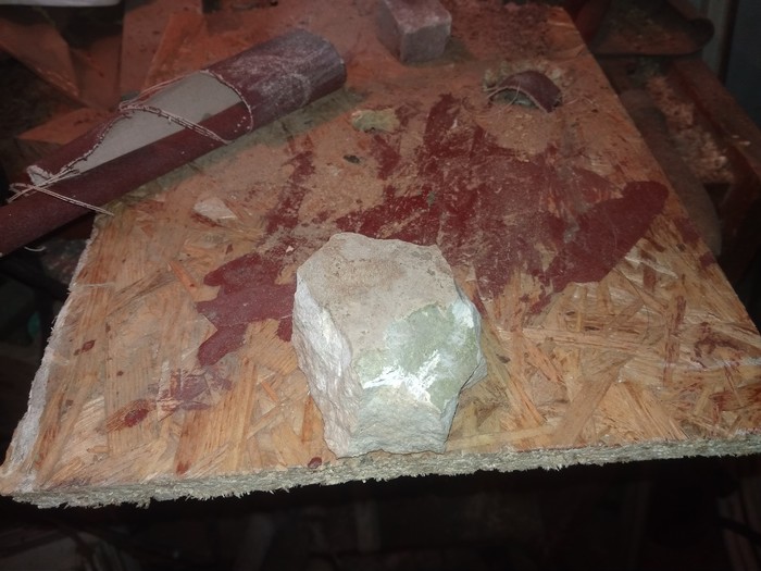 Обратите внимание на трещинку слева от отверстия. Проявилась на этапе шлифовки, надеялся что не сквозная. И да, она оказалась сквозная. Как ни странно, камень выдержал, не раскололся.