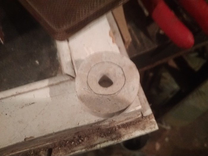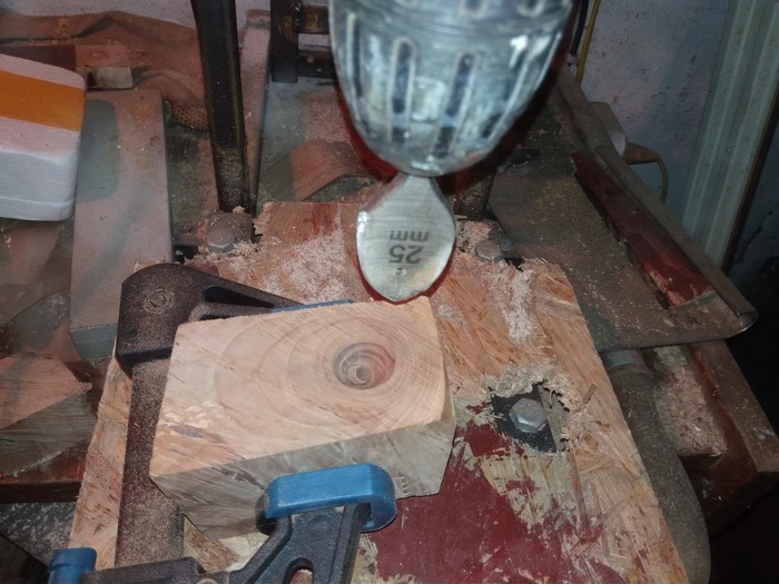 Для высверливания чаши переточил перьевое сверло. Сверлит ОЧЕНЬ тяжело, но сверлит. Заготовку пришлось зажимать в струбцину, у меня нет запасных пальцев, чтоб руками держать.