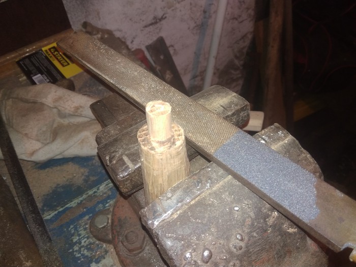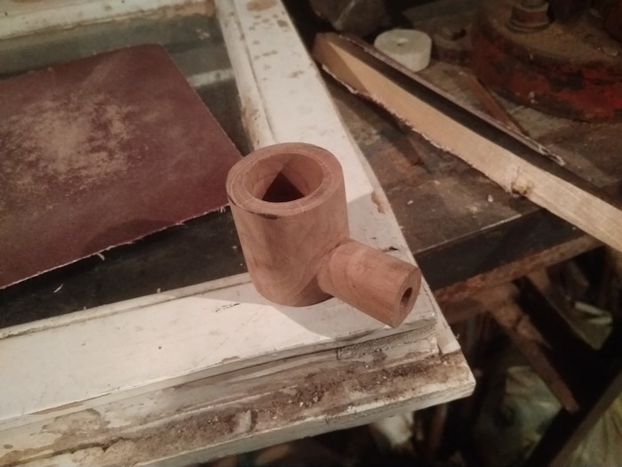 Далее, мундштук. Делал снова из дуба, лучший материал для мундштука из тех, которые мне доступны. В этот раз решил делать его вручную. Почти. Просверлил канал, потом напильником-надфелем-дремелем вывел "штекер". На фото черновой вариант: