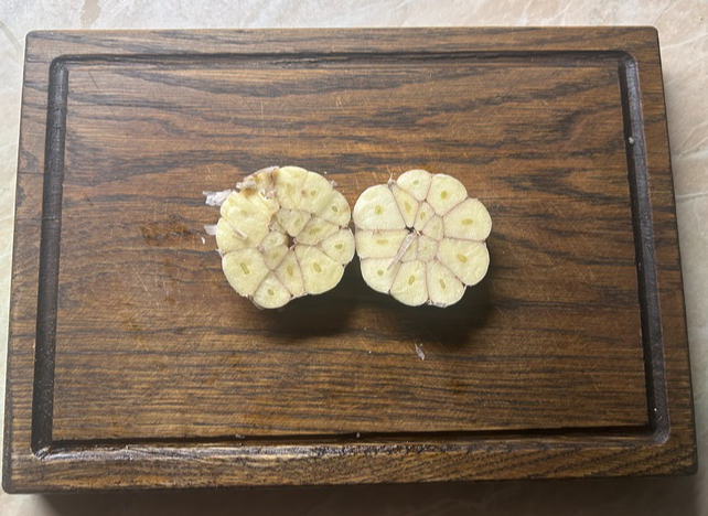 Разрезаем чеснок пополам, ниже на фото будет понятно, стараемся не дать зубчикам развалиться.
