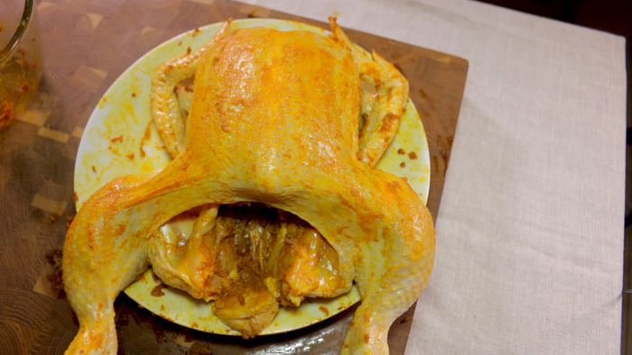 Для приготовления смеси специй смешиваем 4ч.л. сушеного чеснока, 2 ч.л. паприки, 1 ч.л. куркумы, соль, свежемолотый перец, добавляем сок ⅓ лимона и растительное масло. Наносим специи на тушку курицы, равномерно распределяем и оставляем немного помариноваться, пока мы будем подготавливать картофель.