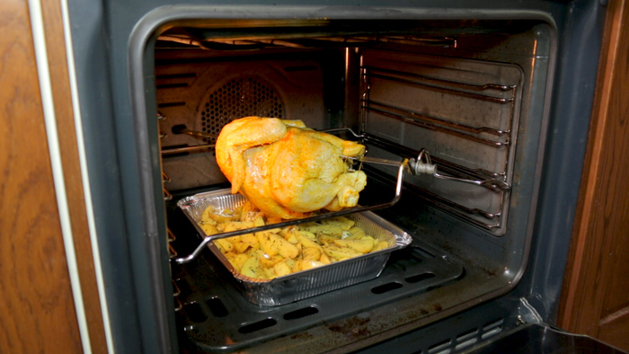 Возвращаемся к тушке курицы. Протыкаем её вертелом и закрепляем удерживающие крепления. Крылья и лапы связываем кулинарным шпагатом, чтобы птица хорошо держалась. Устанавливаем вертел с курицей в духовку. Включаем её в режиме гриль на 180 градусов. Под курицу ставим противень с картошкой.