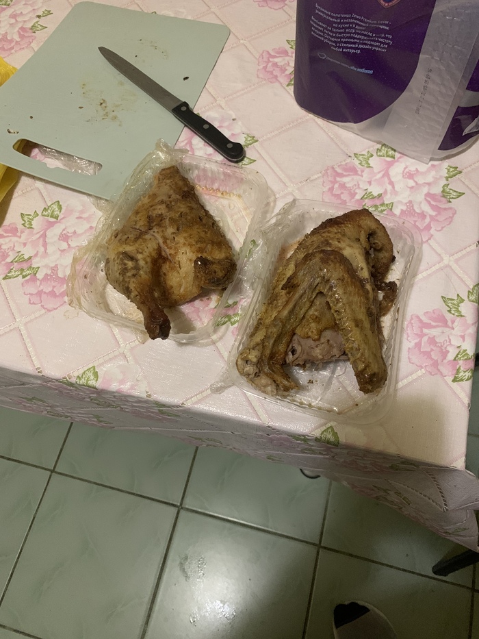Был я, значит, на днях, в городе Касимове Рязанской области, по рабочим делам. Так как дорога была дальняя в сторону дома, то решил остаться на ночлег, в связи с чем было принято решение приобрести курицу-гриль в одной из донер-кебабошных около дороги, чтоб уж совсем не заморачиваться с едой. Пока мне оформляли курицу, купил в довесок шаурму, чтоб просто так не стоять и не ждать. В общем, специалист без усов, но с бородой выдает мне пакет непрозрачный, с двумя контейнерами, говорит: готов курица твой, я порезал её. Ладно, схватил, поехал в номер, накрываю ужин, сыр-зелень-майонез)), достаю курицу: