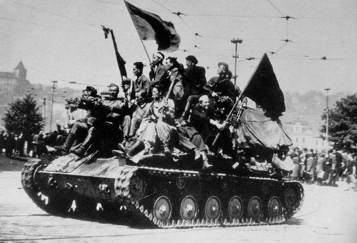 Красноармейцы и чешские повстанцы едут на броне САУ СУ-76М по набережной реки Влтавы в Праге