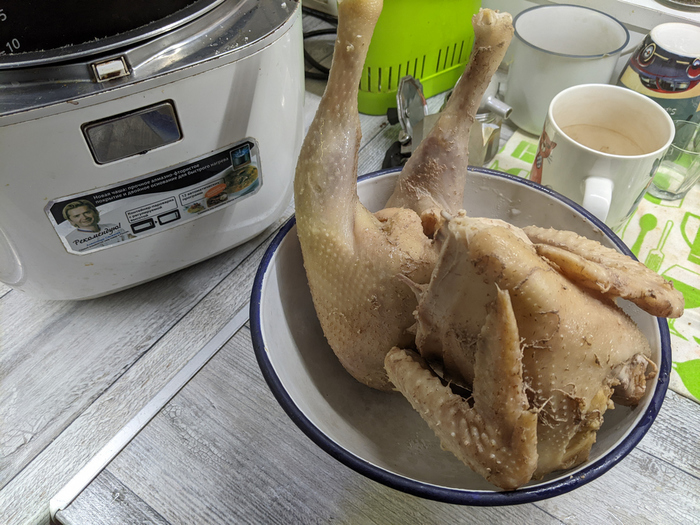 Курицу варим до полуготовности. Я не знаю, какая кура была у ВВП, что его «до полуготовности» это 30 минут, у моей беговой спортивной курицы это уверенные два часа. (А бройлерные запчасти будут готовы полностью за это время, так что их точно не больше 20 минут). Варим обычно - в холодную воду, подсолить (1/2 чайной ложки на литр), если варите в кастрюльке - после закипания снять пену и на маленький огонь. Я это делаю в мультиварке, засунул и забыл.