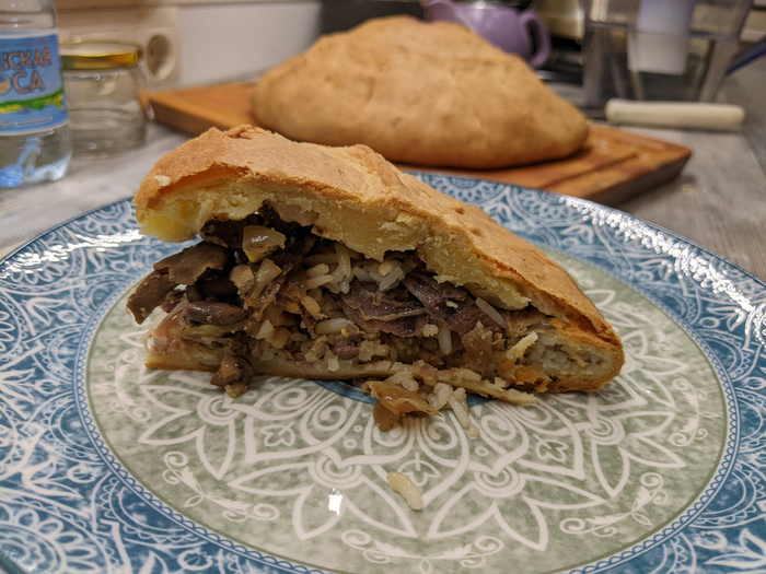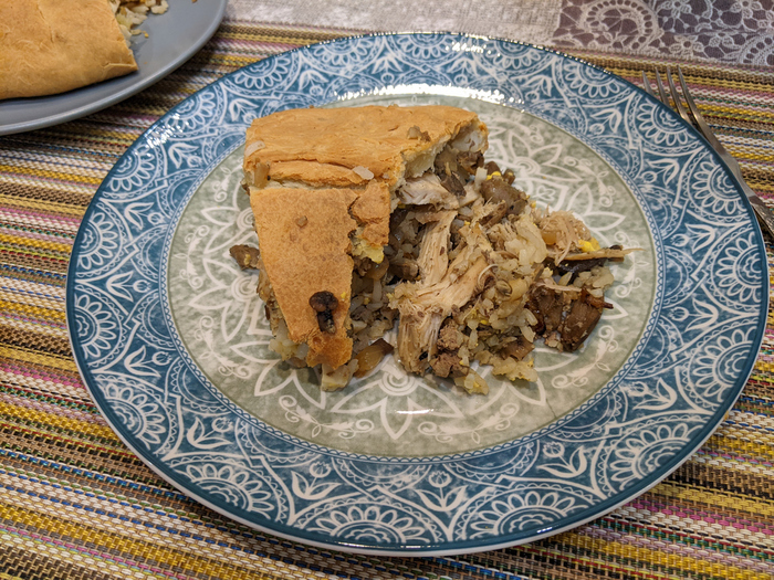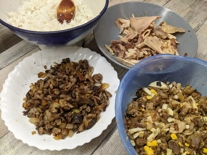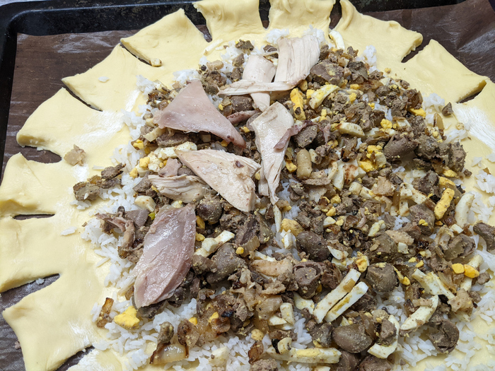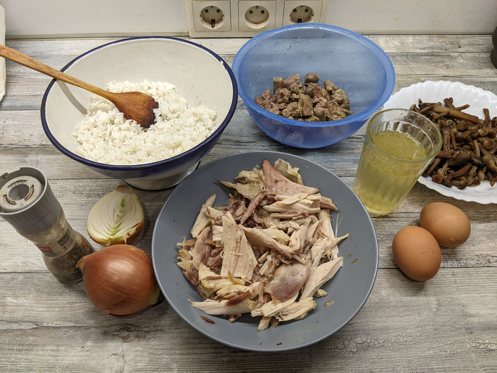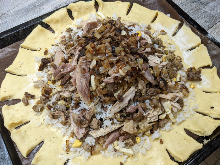 Ну лаааадно, думаю, ладно, хорошо же. Пойдем длинным путем. Суть курника по Сырникову была уже вполне понятна: форма куполом, тонкая хрустящая корочка и много-много начинки. Начинка сложная: кроме курицы, еще рис, который впитает бульон и масло, рубленые крутые яйца, жареный лук, грибы. Выкладываем слоями. На всякий случай я еще напекла накануне блинов - думаю, может, как в кулебяке, прослою.