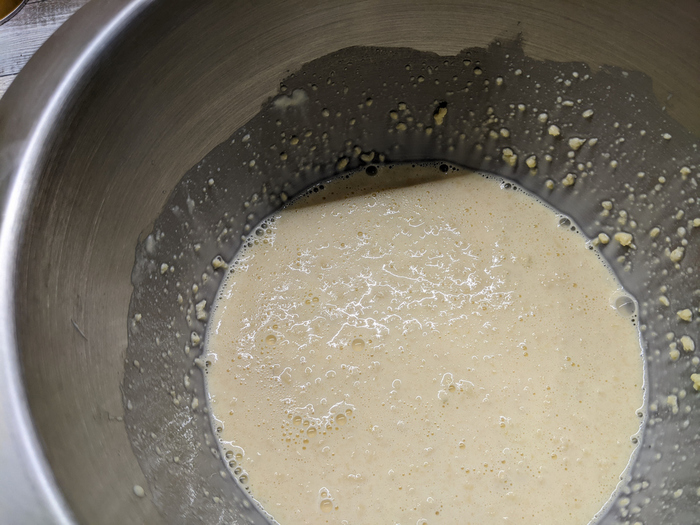 Просеиваем сверху муку и... ну я отправлю в тестомес, вы простите, но у меня суставы ниочинь ). А вы аккуратно месите. Месите, пока тесто не просто соберется в комок, но станет таким... абсолютно не липким, но тягучим.