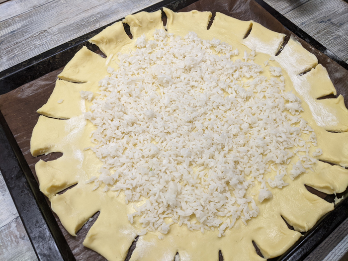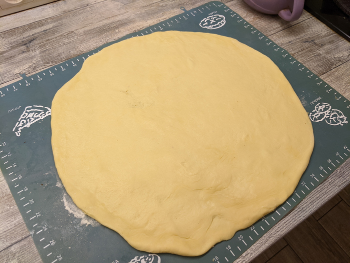 Остаток собираем в шар, расплющиваем и растягиваем в круглый тонкий сочень, можно даже без скалки, я только в самом конце чуть-чуть подкатала. Диаметр - чтоб влезло на противень, по максимуму.