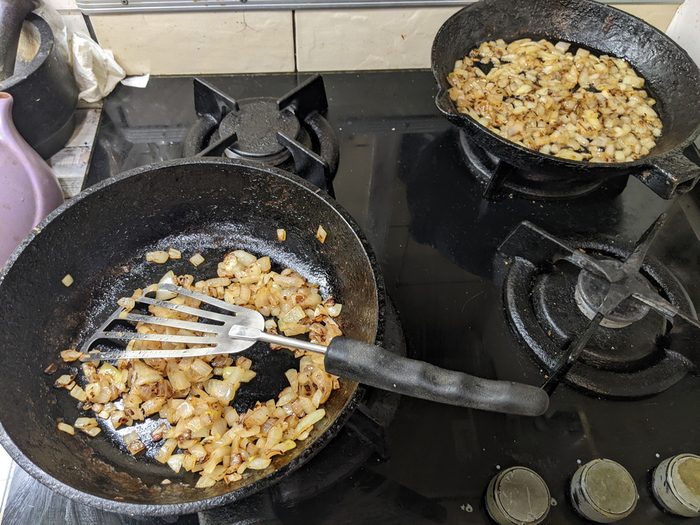 В одну добавим нарубленные грибы, в другую - потрошка и крутые яйца. (Да, у меня капец страшные сковородки, ну зато они заслуженные обе; обе папины, кстати. Алюминиевую он мне отдал, когда я замуж первый раз вышла )).