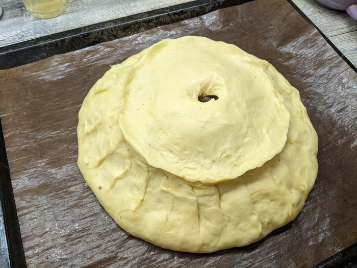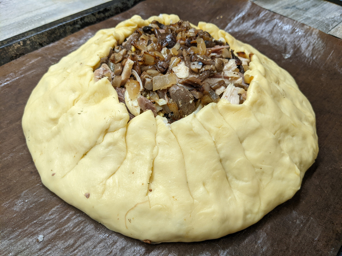 Начинку уплотнить ложкой и полить парой ложек бульона. А дальше я процитирую, это так мило: «собрать края теста и натянуть их слегка к верху так, чтобы получилась стенка вышиною 3–4 вершка (15–18 см), соединить края фестонов вместе и придать курнику форму усеченного конуса, т. е. чтобы сверху суживался». Тесто вообще послушное, но не обольщайтесь, края могут расходиться - очень уж оно жирное. Так что защипывайте как следует. У меня «фестоны» пошли слегка внахлест. Если вы умеете лепить всякие фигурные защипки косичкой, тут будет очень кстати, но я не умею. И вообще, не в красоте счастье ).