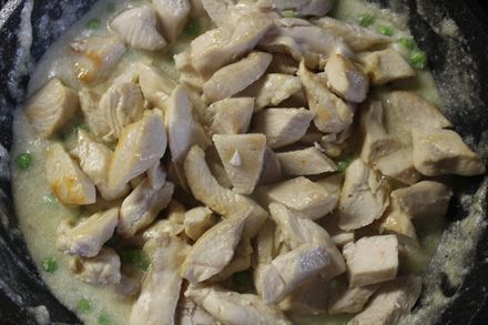 3. Пока поднимается тесто готовим начинку. Сначала ставим вариться окорочка. Для этого обмоем их под проточной водой, положим в кастрюлю, зальем водой и поставим на плиту. После закипания воды снимем пену, посолим, убавим огонь и варим около часа. Когда мясо станет мягким вынем его из бульона, охладим и разберем на волокна или порежем на мелкие кусочки. Мясная начинка готова.