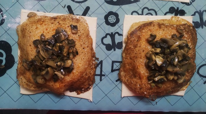 5. Лук чистим, моем и режем мелким кубиком. В сковороду наливаем растительное масло, высыпаем нарезанный лук, ставим на огонь и начинаем обжарку. Шампиньоны, а лучше белые грибы, чистим, моем, режем и выкладываем к жарящемуся луку. Грибы обжариваем 10 мин. Солим и перчим по вкусу. Остужаем. Грибная начинка готова.