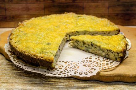 11) Когда пирог начнет немного подрумяниваться, достать его из духовки и посыпать сверху тертым сыром. Убрать пирог обратно в духовку и выпекать до готовности.