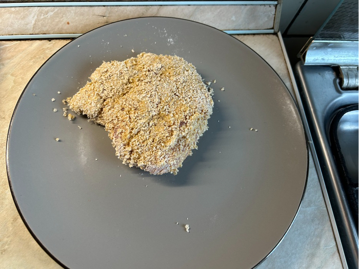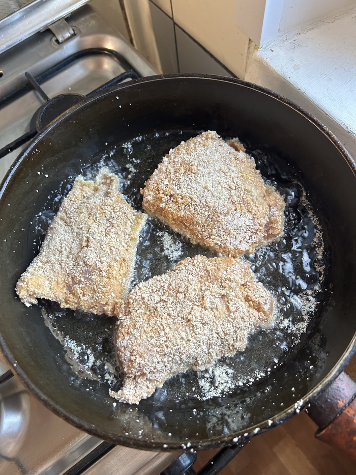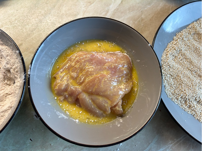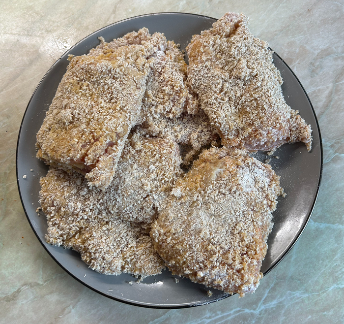 Каждый кусочек по очереди: обваливаем в муке, смачиваем в яйце, обваливаем в сухарях, во всех трех этих шагах, не забываем убедиться в равномерности обработки, в том числе и по краям и бокам.