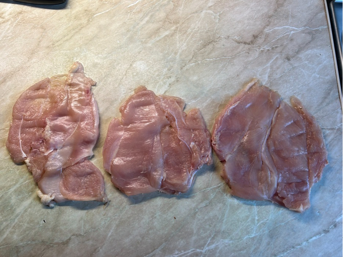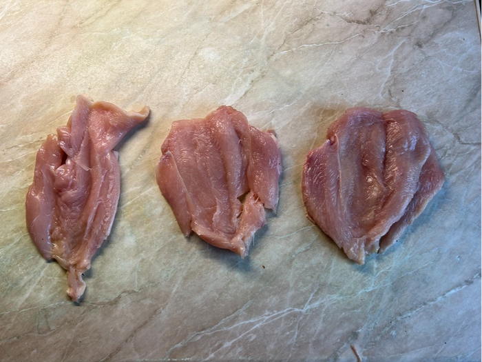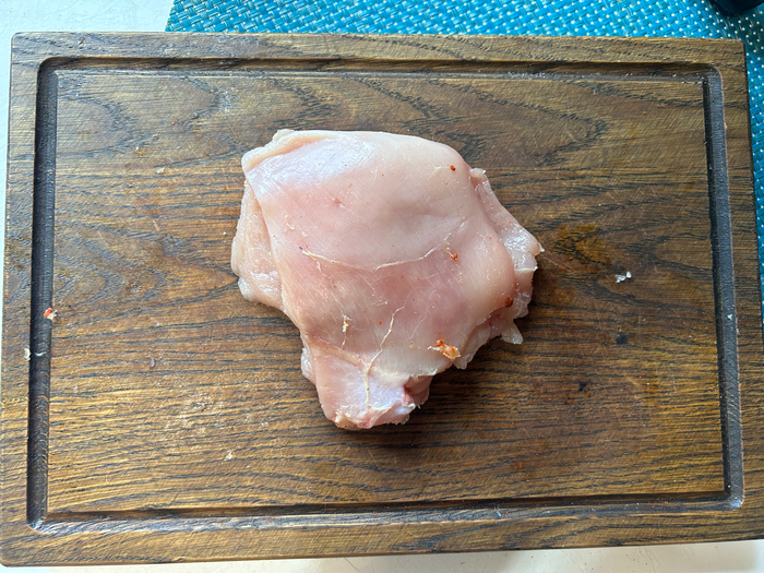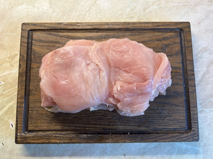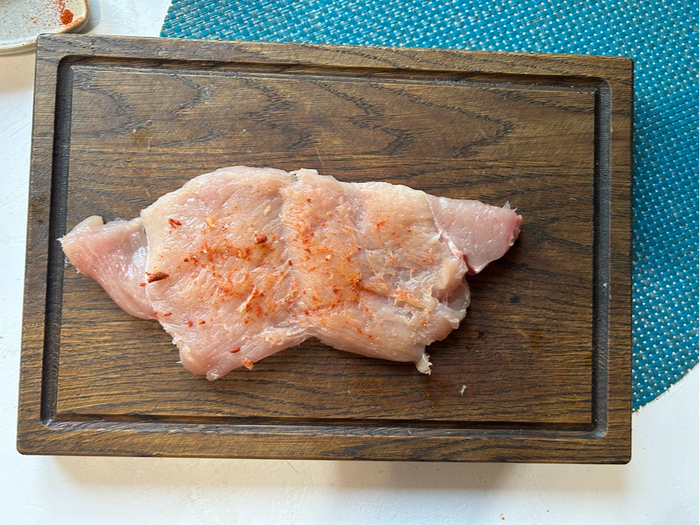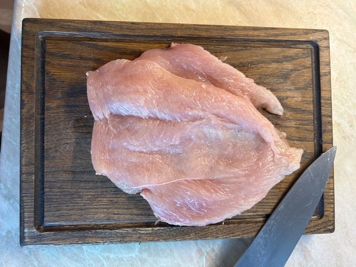 Куренное филе как следует высушим салфетками, обрежем лишние болтающиеся куски.