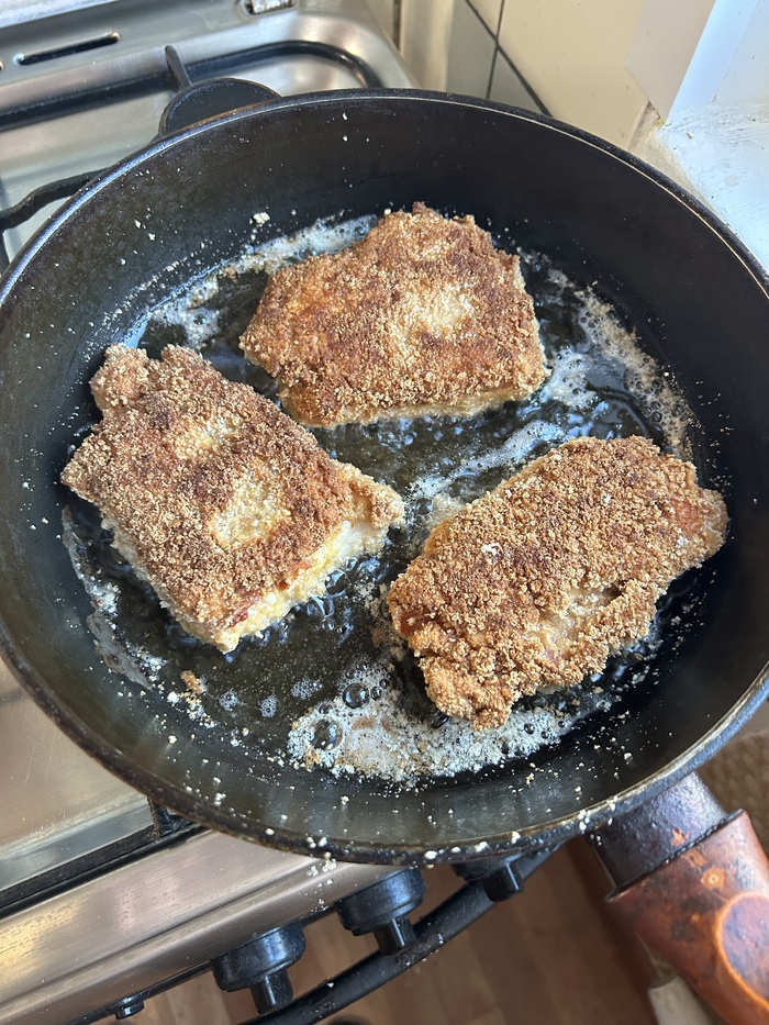 Растительное масло: количество зависит от ваше сковородки, масло при жарке должно покрыть Кордон Блю где то на 1/3-1/2 от толщины.