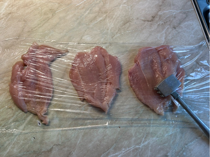 Разворачиваем эти конвертики, накрываем пищевой пленкой и отбиваем их молоточком или скалкой где то до 5-7мм в толщину.