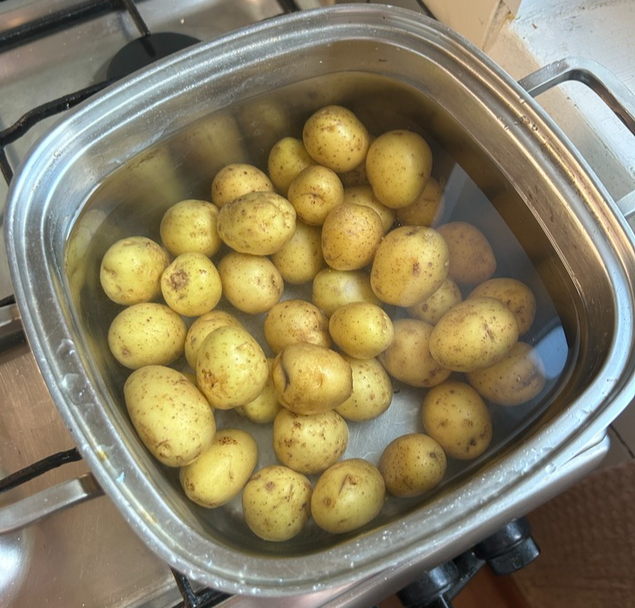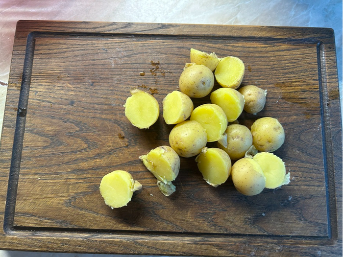 Готовый картофель, разрезаем пополам и закидываем в миску