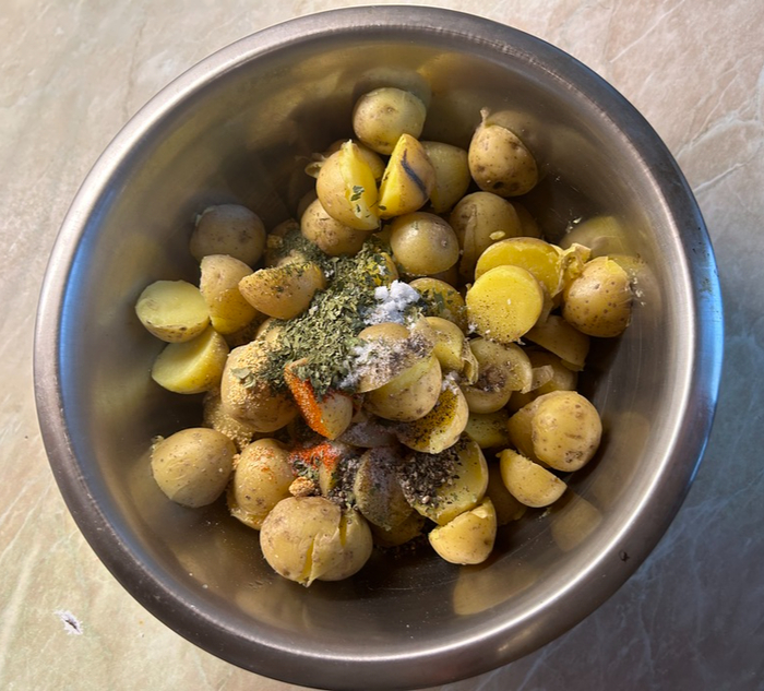 В миске перемешиваем нашу картошку со всеми специями