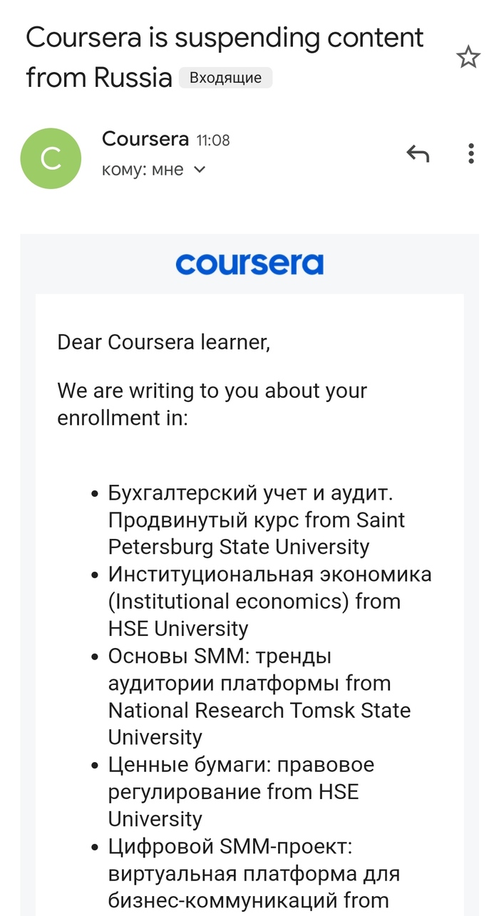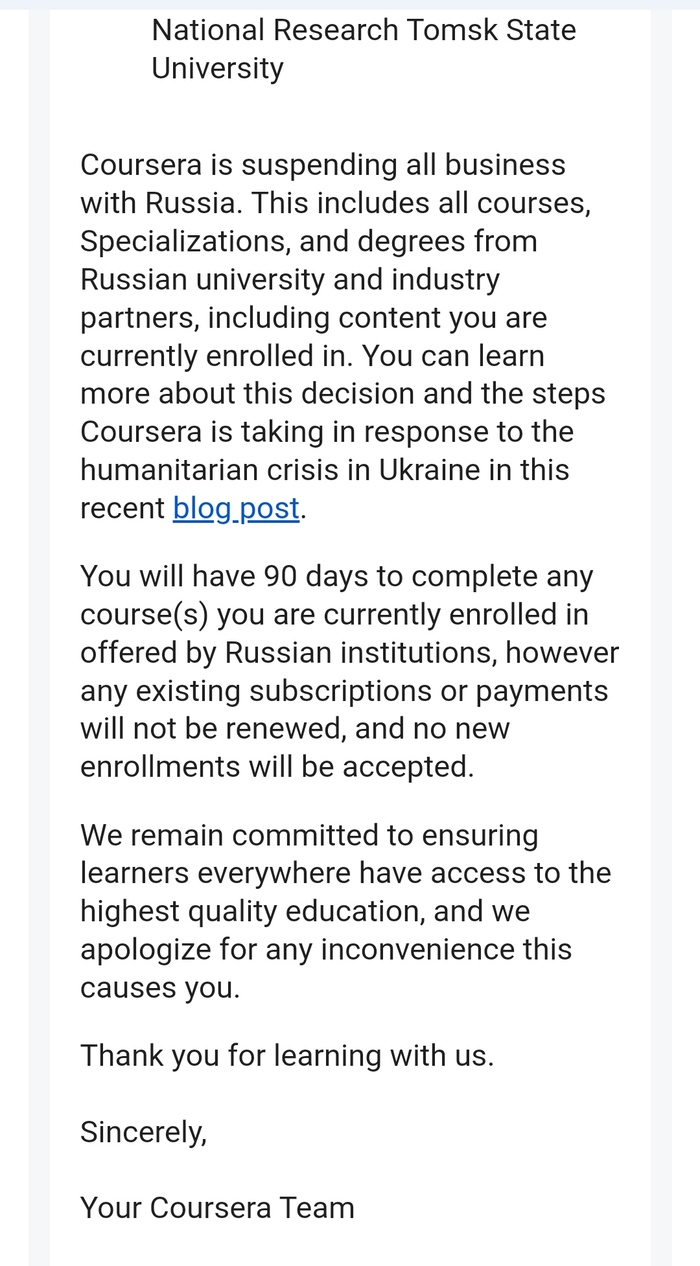 Coursera приостанавливает все дела с Россией. Это включает в себя все курсы, специализации и степени от российских университетов и отраслевых партнеров, включая контент, на который вы в настоящее время зачислены. Вы можете узнать больше об этом решении и шагах, которые Coursera предпринимает в ответ на гуманитарный кризис в Украине, в этой недавней публикации в блоге.
