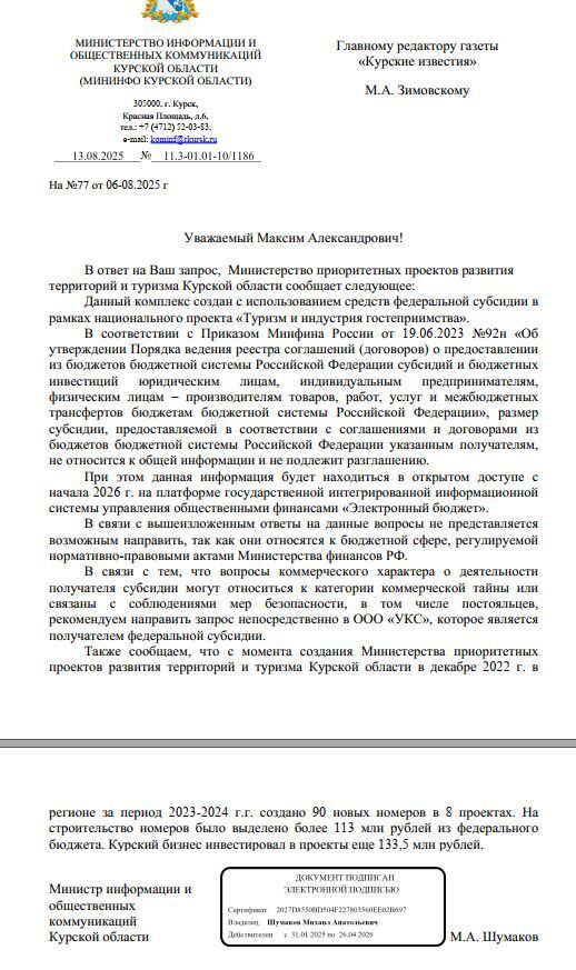 Однако в ответе о комплексе «Патриот» этой информации не было. В Министерстве приоритетных проектов развития территорий и туризма области заявили, что размер субсидии не относится к общей информации и не подлежит разглашению. Чиновники ответили, что не предоставили редакции данные в соответствии с Приказом Минфина РФ. При этом сумму субсидии можно будет узнать на платформе «Электронный бюджет» в 2026 году.